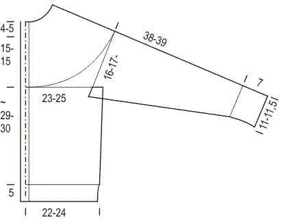 Kun kappaleen korkeus on noin 32(33) cm ja olet viimeksi neulonut II ruutupiirroksen 8. krs:n, aloita seuraavalla kerroksella kädentien kavennukset. Päätä oikeassa reunassa joka 2. krs 1x2 s ja 2x1 s = 55(63) s.