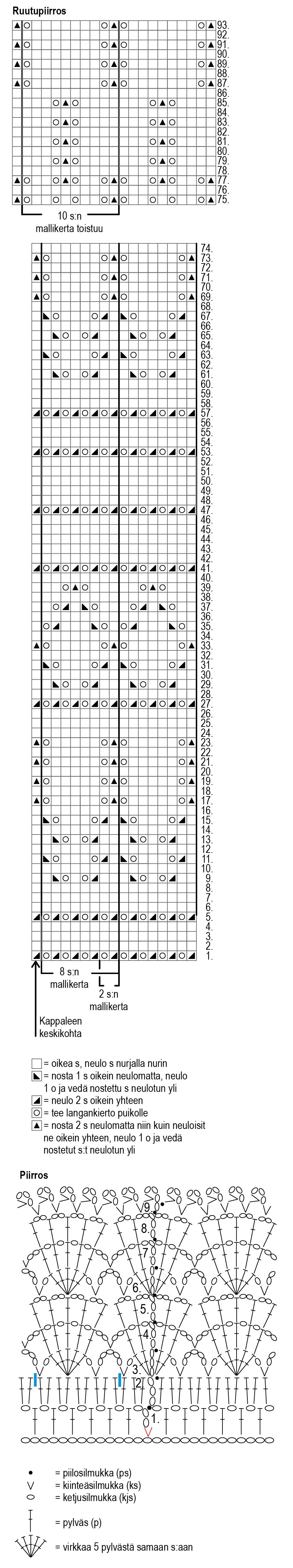 Neulo lisätyilläkin silmukoilla pitsineuletta ja vaihda työhön tarvittaessa pidemmät pyöröpuikot. Huom. 8. krs:n jälkeen aseta esim. silmukkamerkki jokaisen kappaleen keskimmäiseen s:aan. Ruutupiirroksen alareunaan on nuolella merkitty kappaleen keskikohta (= silmukkamerkillä merkitty silmukka), laske jatkossa siitä aina kuvion aloituskohta kullakin kappaleella. Siirrä kappaleiden keskimerkki aina jokaisen oikein neulotun kerroksen jälkeen keskimmäiseen s:aan.