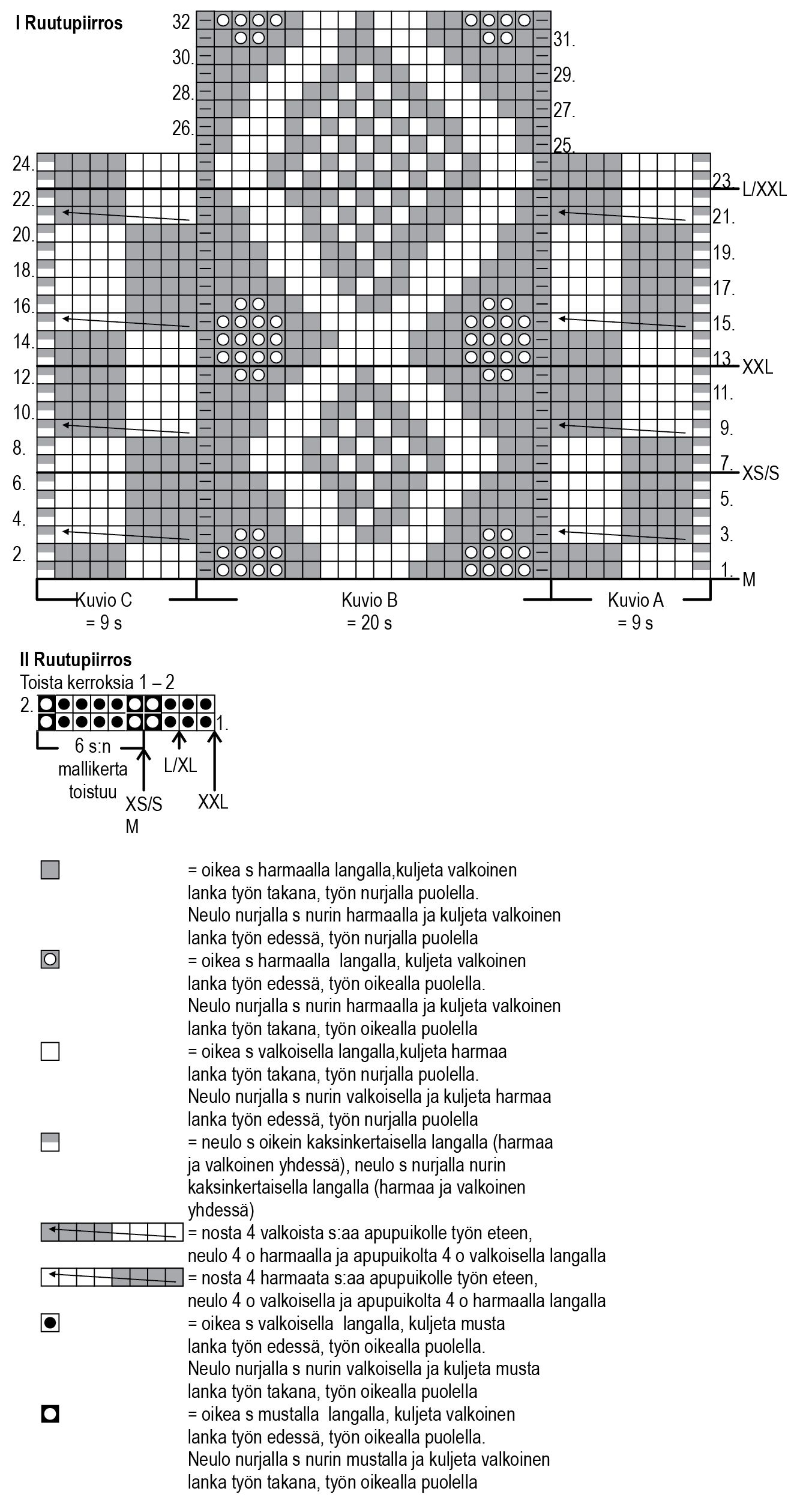 Aloita kirjoneule II ruutupiirroksen 1. krs:lta kukin koko nuolella alareunaan merkitystä kohdastaan ja toista sitten 6 s:n mallikertaa kerros loppuun tarpeen mukaan. Kierrä aina kerroksen lopussa langat toistensa ympäri. Neulo ruutupiirroksen 2. krs ja toista sitten kerrokset 1-2 vielä 2 kertaa.
