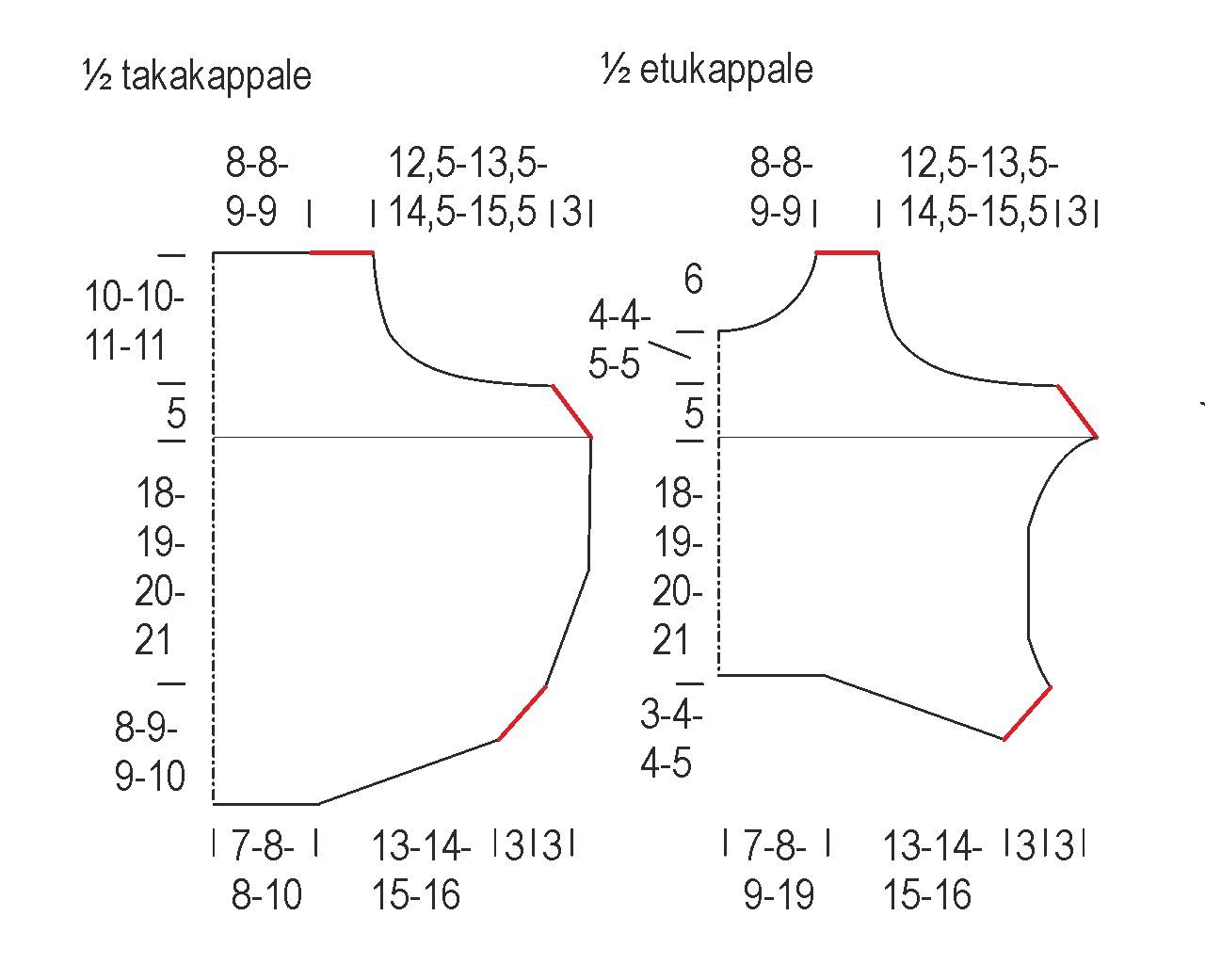 Huom. Kun olan aukon korkeus on 4(4)5(5) cm, päätä pääntietä varten keskimmäiset 12(12)14(14) s ja neulo ensin pääntien toinen puoli. Päätä pääntien reunassa joka 2. krs 2x3 s ja 1x2 s.