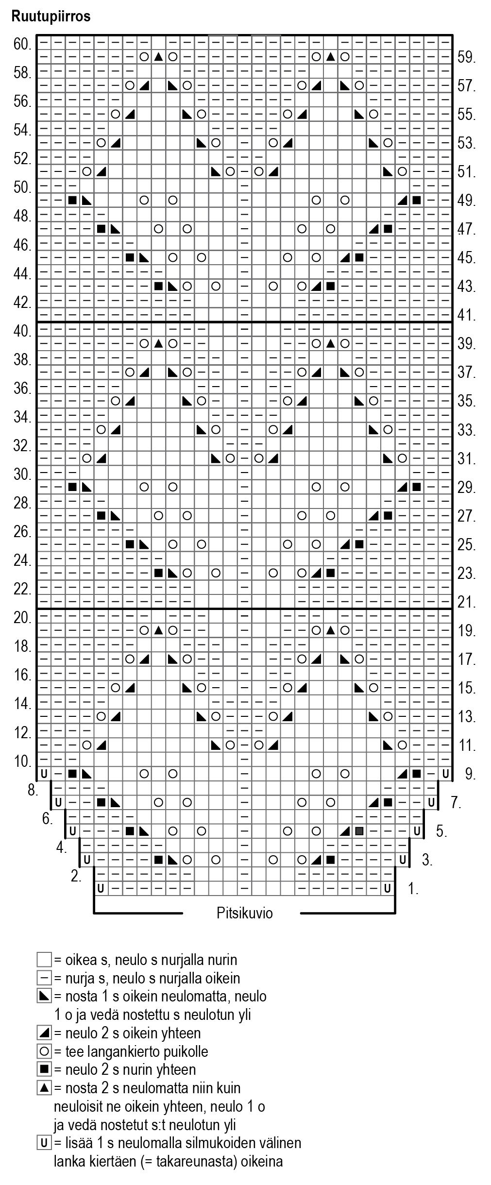neulo ruutupiirroksen ja ohjeen mukaan. Joustinneule suljettuna neuleena: neulo *2 o, 2 n*, toista *-*.