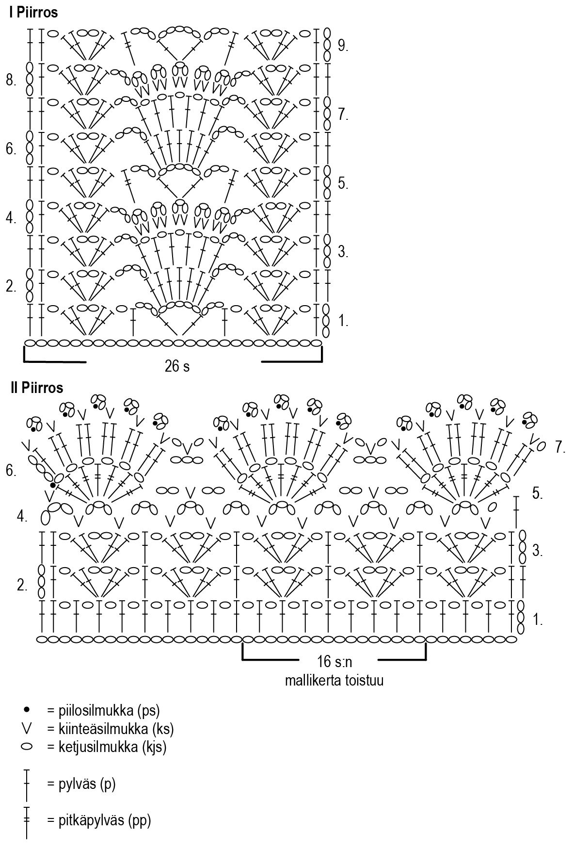 Jatka virkkaamista I piirroksen mukaan kerrokselta 2. Virkkaa ensin kerrokset 2-4 ja toista sitten kerroksia 5-8, kunnes pitsin pituus on noin 26(26)28(28)30 cm. Katkaise lanka. Virkkaa toinen välipitsi samoin.