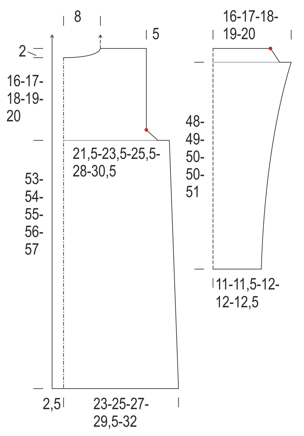 Huom. kun kappaleen korkeus on 27(28)28(29)29 cm, kavenna oikeasta reunasta 1 s. Toista kavennus 17 cm:n kuluttua ja vielä 5 cm:n kuluttua = 47(51)55(60)64 s.