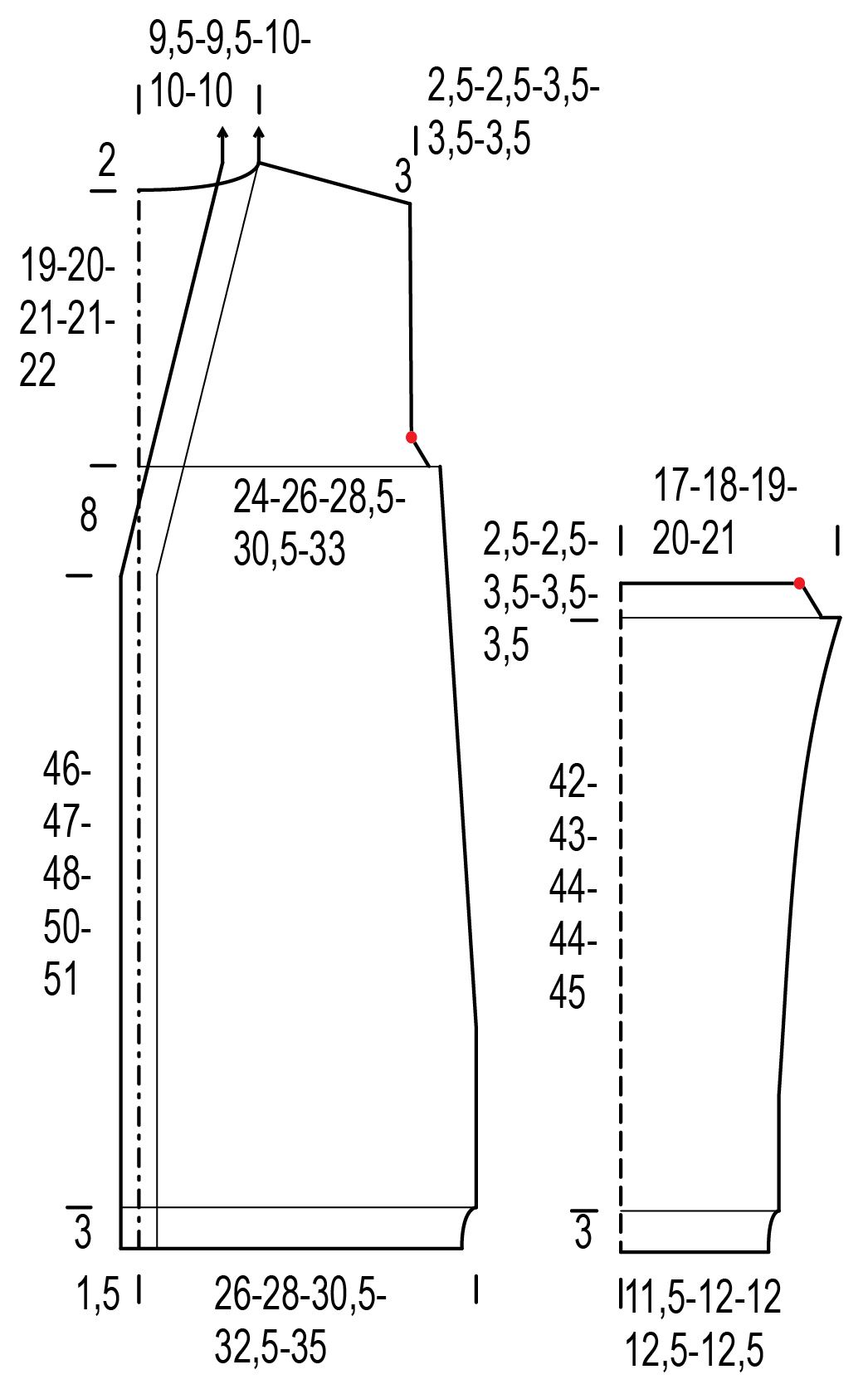 Kun kappaleen korkeus on 57(58)59(61)62 cm, päätä kädentietä varten oikeassa reunassa 1x3(3)4(4)4 s. Kavenna oikeassa reunassa joka 2. krs 2(2)3(3)3x1 s: neulo oikean puolen kerroksella 1 o, neulo 2 s oikein yhteen ja neulo kerros loppuun.