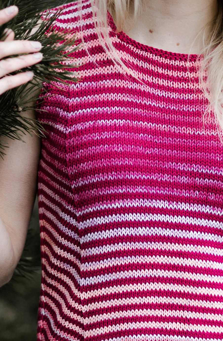 Toista näitä kahta kerrosta vuorotellen 2 krs kirsikan värisellä ja 2 krs kirjavalla langalla.
