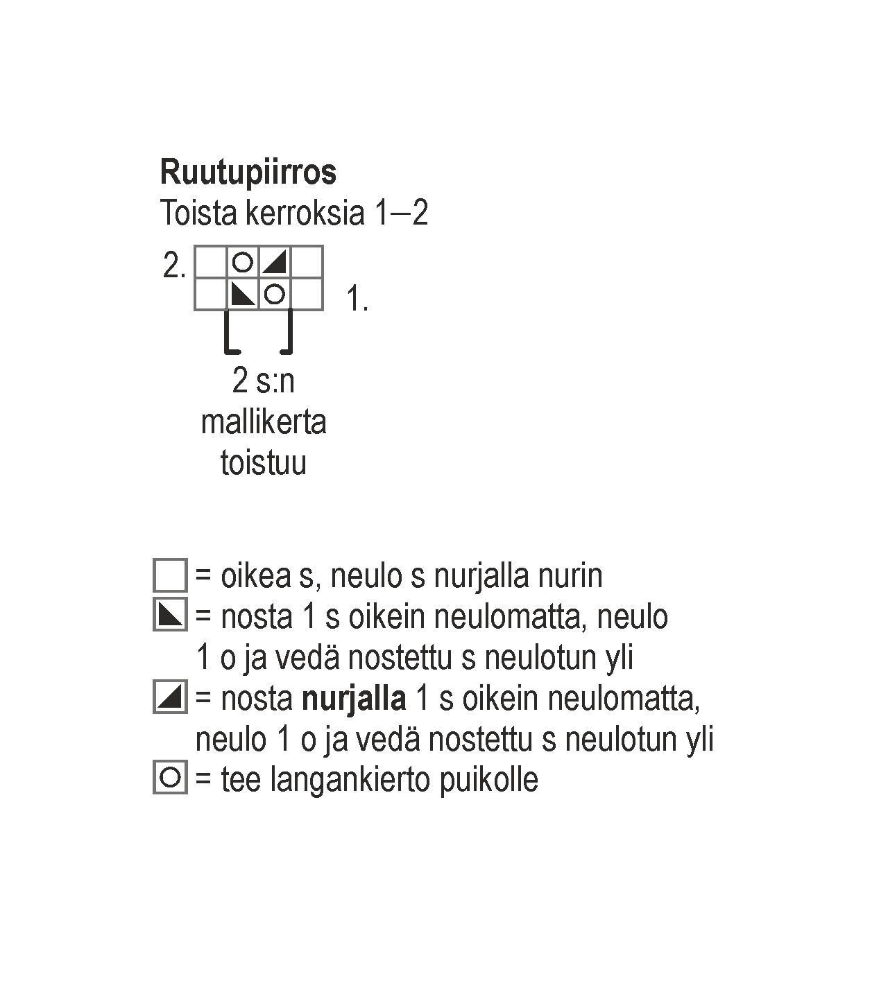 Aloita pitsineule ruutupiirroksen 1. kerrokselta seuraavasti: neulo piirroksen oikeasta reunasta 1 s, toista sitten 2 s:n mallikerta 20(21)22(24)25(26) kertaa ja neulo vielä vasemman reunan 1 s. Toista ruutupiirroksen kerroksia 1-2.