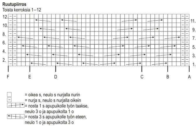 Luo 88(100)108(120)132 s. Neulo nurjalla 11(11)15(15)15 n, 2 o, 62(74)74(86)98 n, 2 o ja 11(11)15(15)15 n. Aloita kohoneule ruutupiirroksen 1. kerrokselta seuraavasti: neulo 11(11)15(15)15 s:lla sileää oikeaa neuletta, neulo väli A-B (= 5 s), toista väli B-C 3(4)4(5)6 kertaa [= 18(24)24(30)36 s], neulo väli C-D (= 20 s), toista väli D-E 3(4)4(5)6 kertaa [= 18(24)24(30)36 s], neulo väli E-F (= 5 s) ja neulo lopuksi 11(11)15(15)15 s:lla sileää oikeaa neuletta. Toista kohoneuleessa ruutupiirroksen kerroksia 1-12.