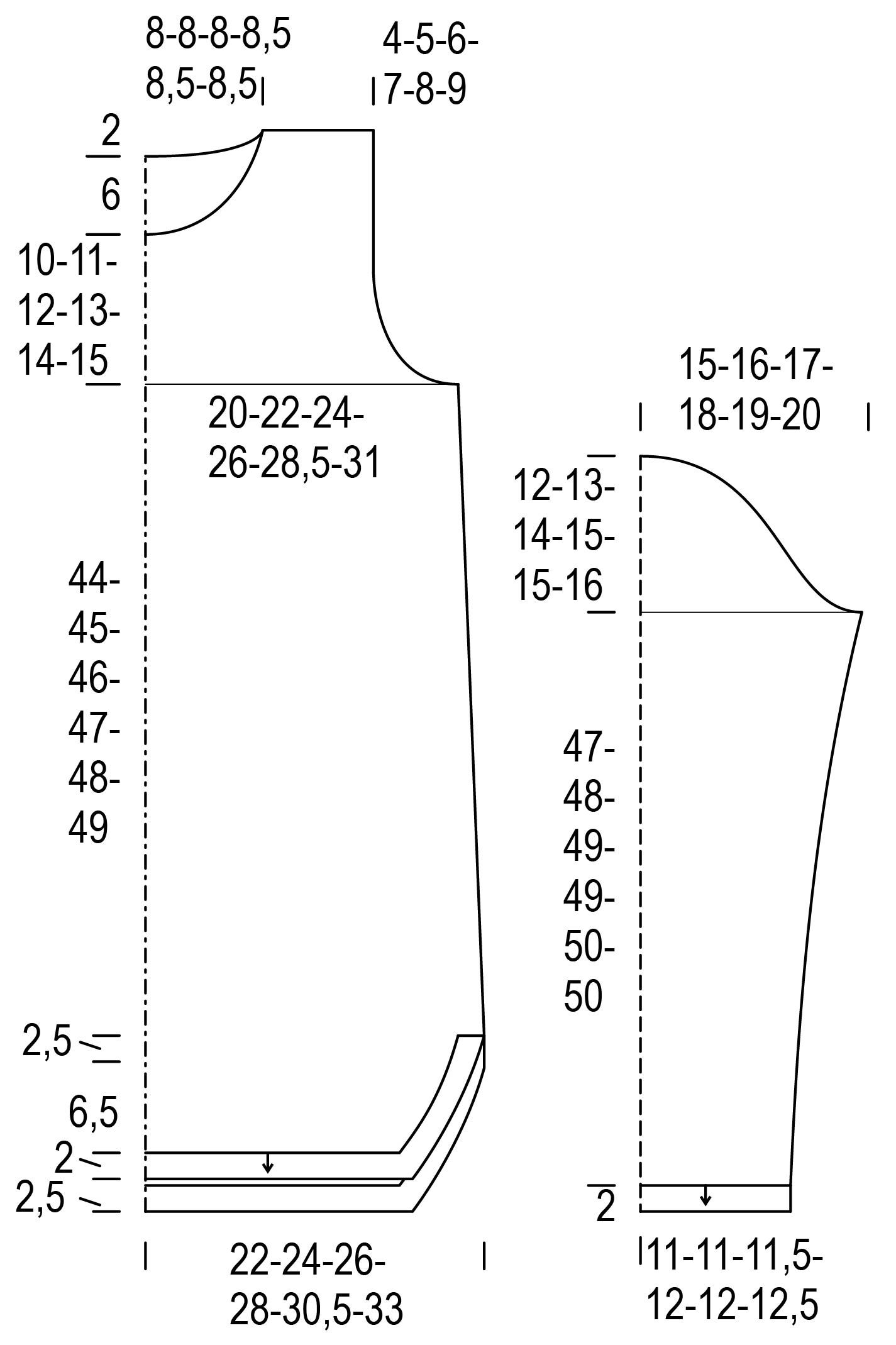 Kun kappaleen korkeus on 44(45)46(46)47(47) cm, päätä molemmissa reunoissa joka 2. krs 1x4(4)5(5)6(6) s, 1x3 s, 2(2)3(3)3(3)x2 s, 10(11)11(13)13(14)x1 s, 1x2 s ja 1x3 s. Päätä loput s:t. Neulo toinen hiha samoin.
