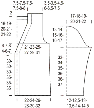 Luo 47(49)51(53)55(57) s ja neulo ainaoikeaa 9 krs. Neulo sitten vuorotellen sileää oikeaa neuletta 2 krs ja sileää nurjaa neuletta 14 krs. Kun kpl:n korkeus on 10 cm, lisää molemmissa reunoissa 1 s. Toista lisäykset vielä joka 8.(8.)6.(6.)6.(6.) krs 2(0)10(9)7(6) kertaa ja sitten joka 6.(6.)4.(4.)4.(4.) krs 6(9)0(2)5(7) kertaa = 65(69)73(77)81(85) s. Kun kpl:n korkeus on 33(34)35(36)36(37) cm, päätä molemmissa reunoissa joka 2. krs 1x4(4)4(4)5(5) s, 2(2)3(3)3(3)x2 s, 14(15)16(17)17(18)x1 s, 1x3 s ja 1x2 s. Päätä loput s:t. Neulo toinen hiha samoin.