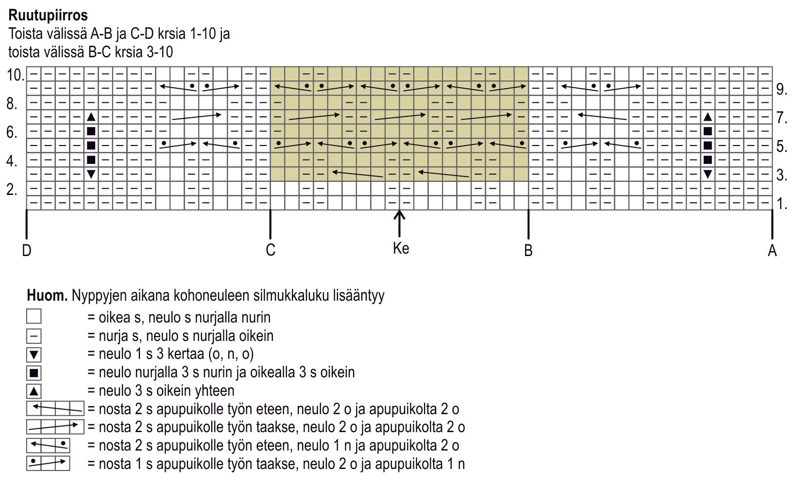 Luo paksummille puikoille 128(134)142(150)158 s ja neulo ainaoikeaa 5 krs. Aloita sitten sileä neule ja palmikkokuvio ruutupiirroksen 1. krs:lta seuraavasti: neulo 38(41)45(49)53 s sileää oikeaa neuletta, ruutupiirroksesta väli A-D (= 52 s) ja 38(41)45(49)53 s sileää oikeaa neuletta. Toista välissä A-B sekä C-D krsia 1-10 ja neulo välissä B-C ensin krs:t 1-10 ja toista sitten krsia 3-10. Kun kpl:n korkeus on 3(3)4(5)5 cm, kavenna molemmissa reunoissa 1 s seuraavasti: neulo oikean puolen kerroksella 1 o, tee ylivetokavennus ja kun krs:lla on jäljellä 3 s, neulo 2 s oikein yhteen ja 1 o. Toista kavennukset kuten edellä 2 cm:n välein vielä 20(19)19(18)18 kertaa = 86(94)102(112)120 s. Kun kpl:n korkeus on noin 45(45)46(46)47 cm ja olet viimeksi neulonut kuviossa A-B ruutupiirroksen 10. krs:n, vaihda työhön ohuemmat puikot ja aloita joustinneule oikean puolen kerroksella seuraavasti: neulo 2(2)2(3)3 n, *2 o, 2 n*, toista *-* ja neulo lopuksi 2 o, 2(2)2(3)3 n. Kun kpl:n korkeus on 63(64)65(66)67 cm, päätä molemmissa reunoissa joka 2. krs 1x3(4)4(5)6 s, 1(1)2(2)2x2 s ja 2(3)3(4)4x1 s kädenteitä varten = 72(76)80(86)92 s. Kun kädentien korkeus on 3(4)5(6)7 cm, jätä seuraavalla oikean puolen kerroksella keskimmäiset 34 s odottamaan pääntietä varten ja neulo krs loppuun. Jätä oikean puoleiset s:t odottamaan ja neulo ensin pääntien vasen puoli. Päätä pääntien reunassa joka 2. krs 3x2 s ja 4x1 s. Kun kädentien korkeus on 19(20)21(22)23 cm, päätä loput olan 9(11)13(16)19 s. Neulo pääntien toinen puoli vastaavasti.