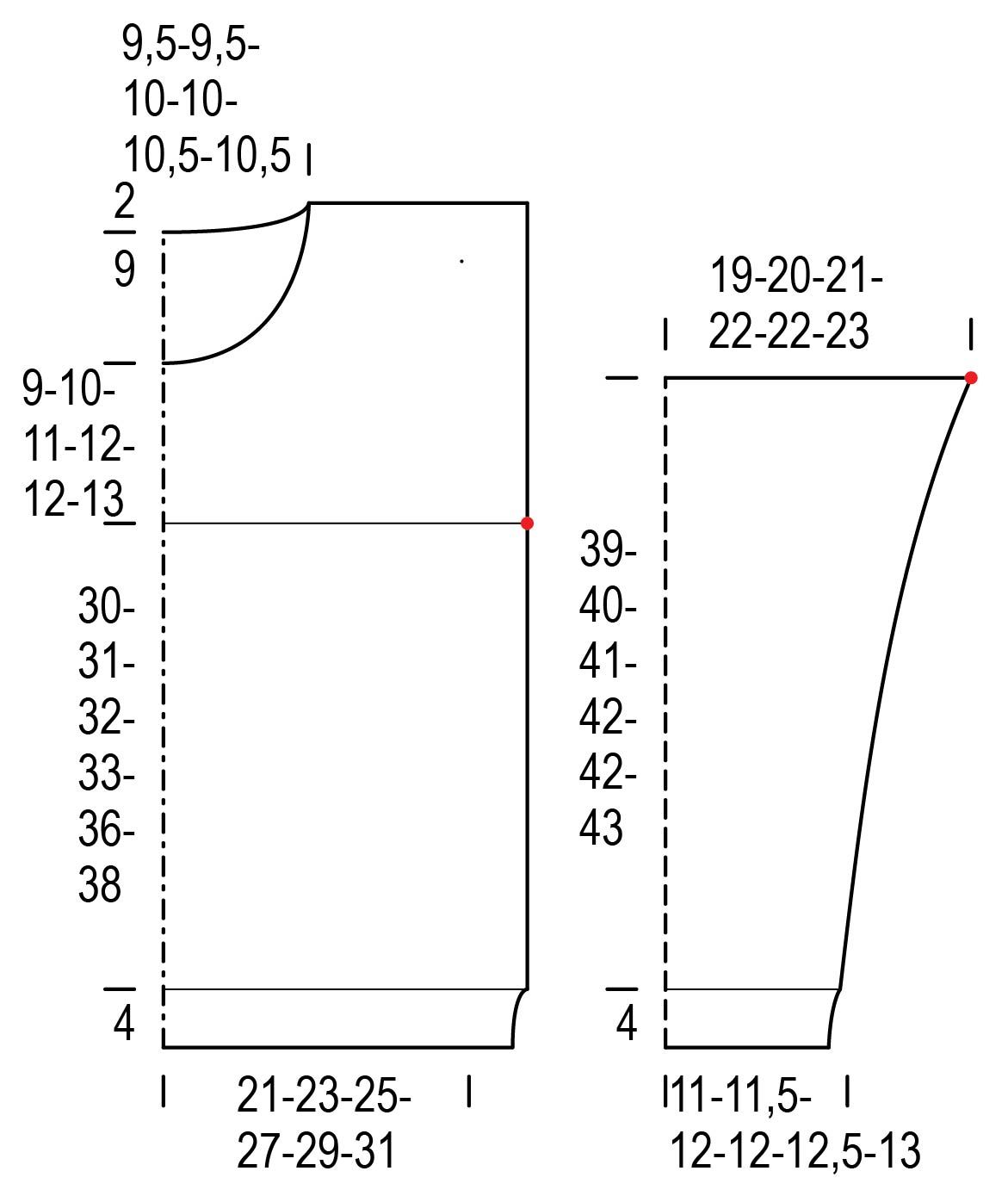 Kun kappaleen korkeus on 6(6)6(6)7(7) cm, lisää molemmissa reunoissa 1 s. Toista lisäykset 2,5(2,5)2,5(2)2(2) cm:n välein vielä 5(3)1(16)17(16) kertaa ja 2(2)2(1,5)1,5(1,5) cm:n välein 11(14)17(4)2(4) kertaa = 81(85)89(93)93(97) s.