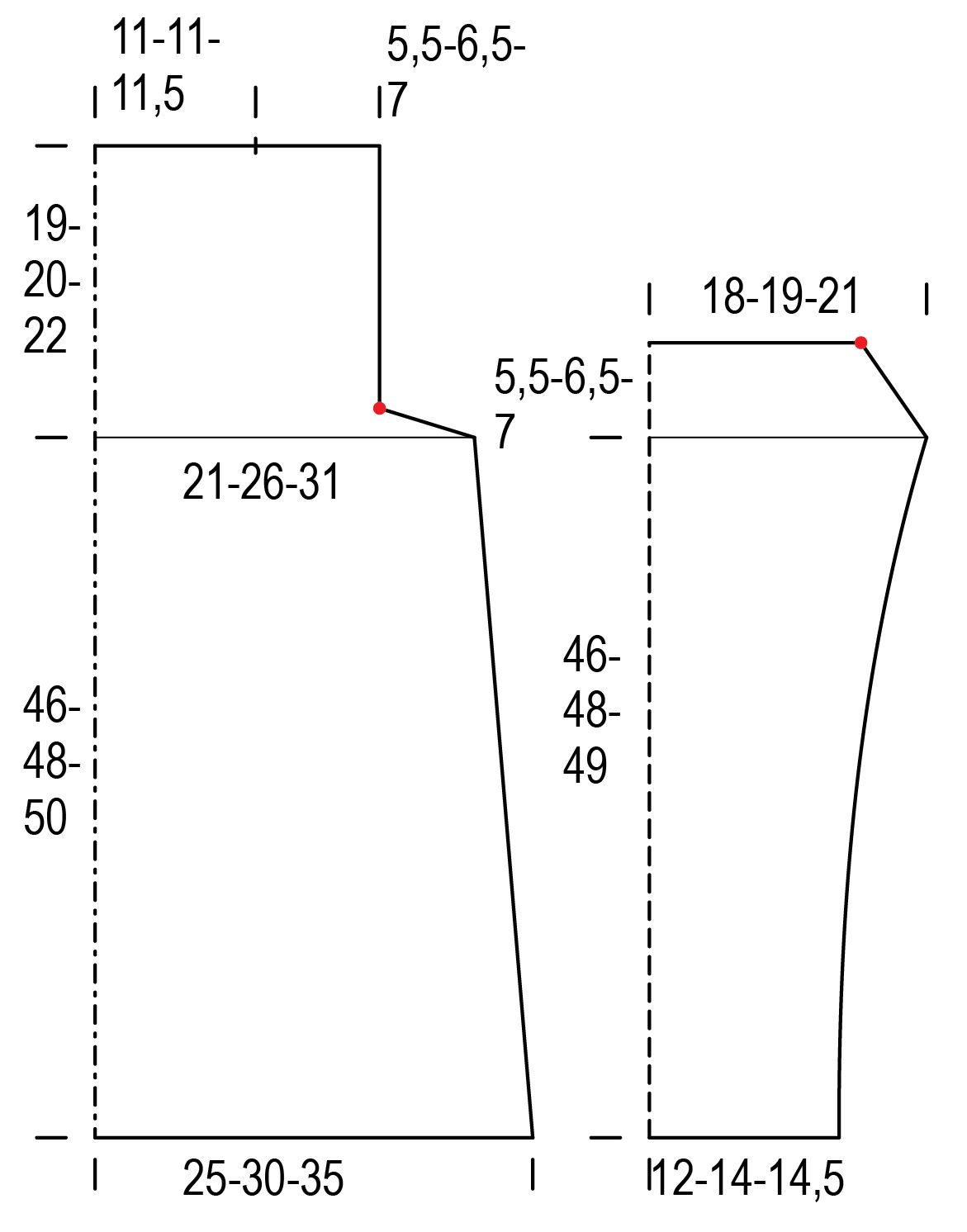 Kun kappaleen korkeus on 19(20)18 cm, lisää molemmissa reunoissa 1 s. Toista lisäykset 3(4)3,5 cm:n välein vielä 8(6)8 kertaa = 60(62)72 s. Neulo lisätyillä s:illa sileää oikeaa neuletta.