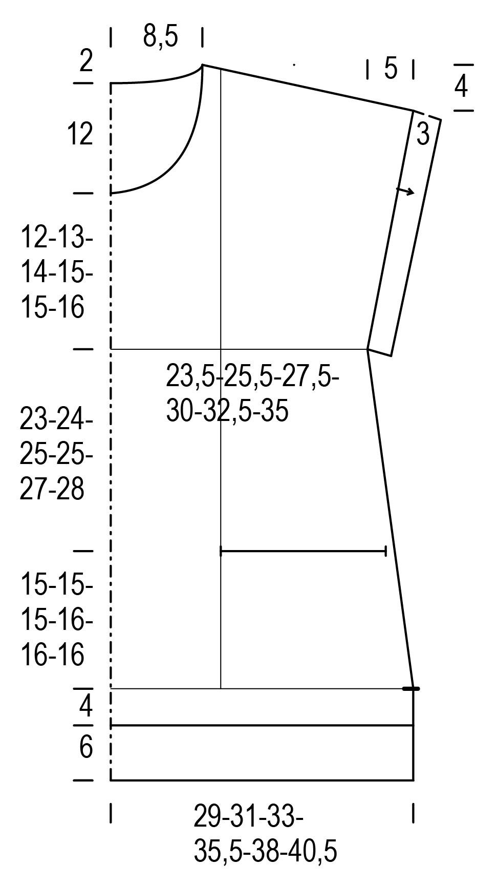 Kun kädentien korkeus on 22(23)24(25)25(26) cm, päätä olkaa varten molemmissa reunoissa joka 2. krs 6x5 s ja 2x6 s (8x6 s) 4x6 s ja 4x7 s (1x8 s ja 7x7 s) 1x7 s ja 7x8 s (3x8 s ja 5x9 s).