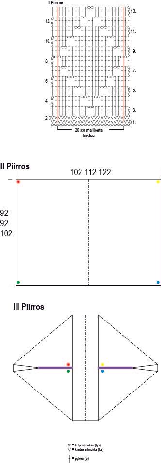 Taita kappaleen kulmat vastakkain II ja III piirroksen mukaan ja kiinnitä kappaleet noin 20(20)22 cm:n matkalta (merkitty piirrokseen liilalla) virkkaamalla ks:ita työn nurjalta puolelta.