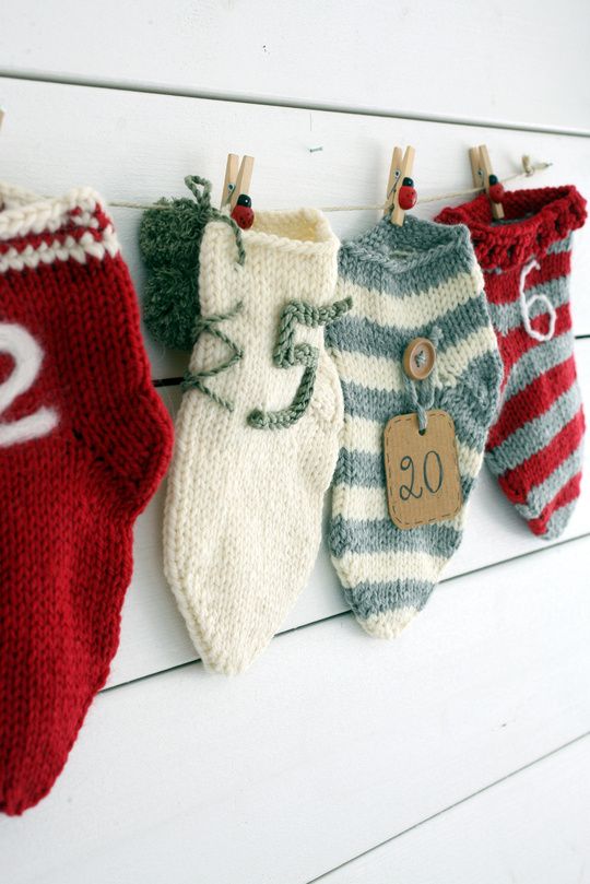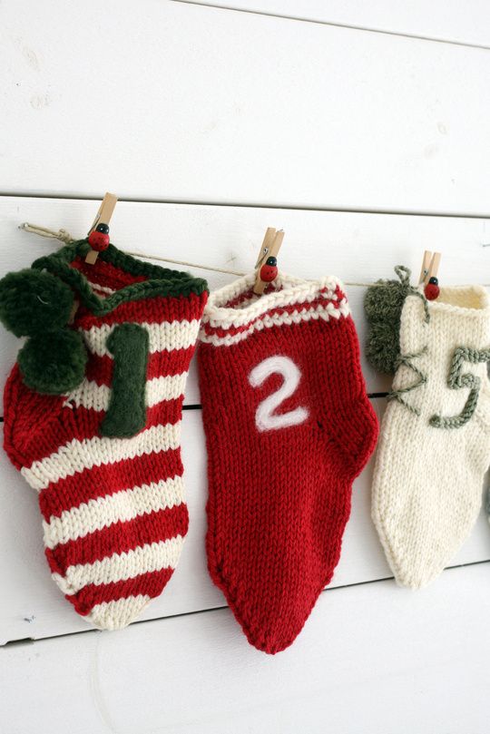 Neulo hauskat joulukalenterin sukat Novita Isoveli -langasta jotka ilahduttavat sisustuksessa vaikka koko talven.