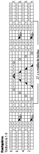 Luo 75 s. Neulo molemmissa reunoissa 6 s:lla ainaoikeaa ja keskimmäisillä 63 s:lla joustinneuletta. Kun kaitaleen korkeus on 3 cm, aloita pitsineule ruutupiirroksen 1.krs:lta seuraavasti: neulo piirroksen oikeasta reunasta 6 s, toista sitten 27 s:n mallikerta 2 kertaa ja neulo vielä piirroksen vasemmasta reunasta 15 s. Toista ruutupiirroksen krs:ia 1-8. Kun kpl:n korkeus on n. 120 cm ja olet viimeksi neulonut 8.krs:n, neulo molemmissa reunoissa 6 s:lla ainaoikeaa ja keskimmäisillä 63 s:lla joustinneuletta 3 cm. Päätä s:t kerralla.