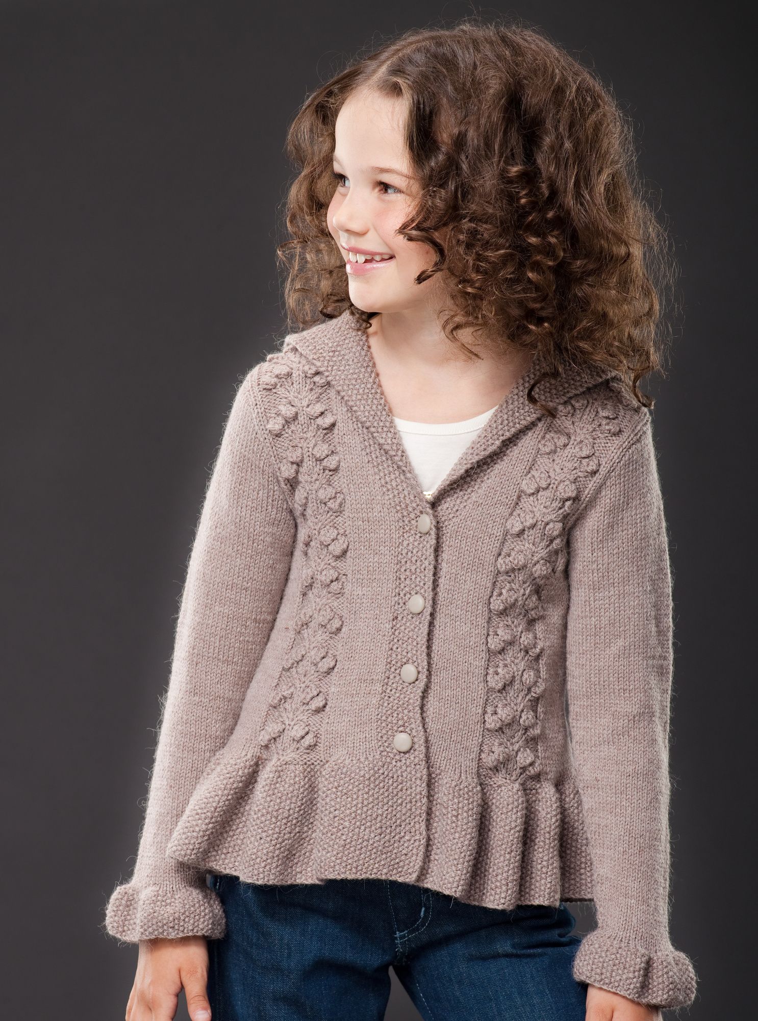 Suloinen neulottu tytön pintaneuletakki Novita Nalle -langasta.