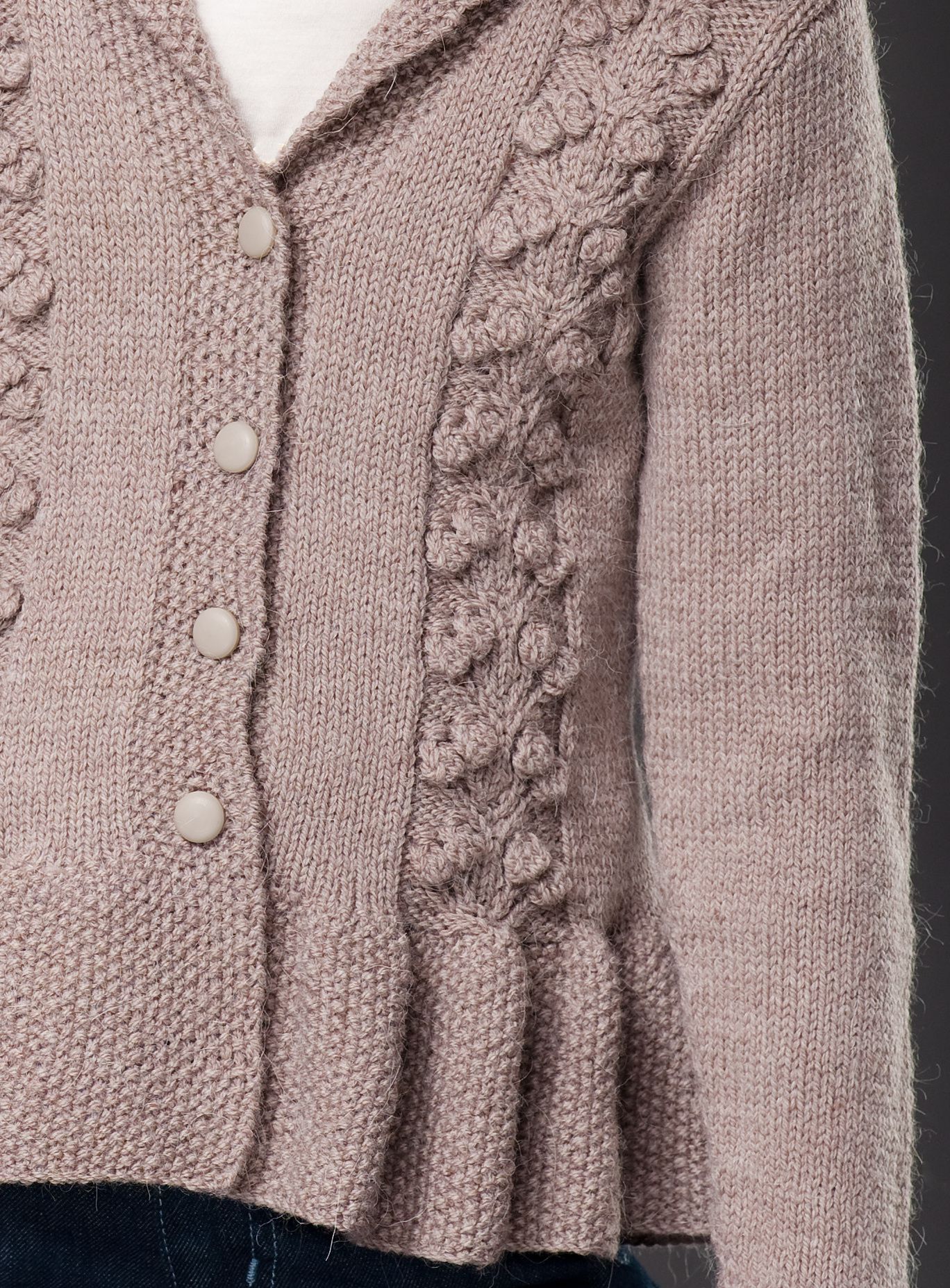 Aseta kpl:eet alustalle mittoihinsa, kostuta sumuttamalla työn nurjalta puolelta ja anna kuivua. Ompele olkasaumat. Kiinnitä hihat kädenteille. Ompele sivu- sekä hihojen saumat. Poimi pääntieltä odottavien 32(32)36(36) s:n lisäksi takakappaleen pääntieltä 26(26)28(28) s = 58(58)64(64). Neulo näillä s:illa helmineuletta ja lisää tarvittaessa olkasaumojen kohdalla 1 s, jotta helmineule jatkuu etukappaleilla rikkoutumatta. Kun kauluksen korkeus on 9(9)10(10) cm, päätä s:t kerralla helmineuletta neuloen. Kiinnitä napit miehustaan.