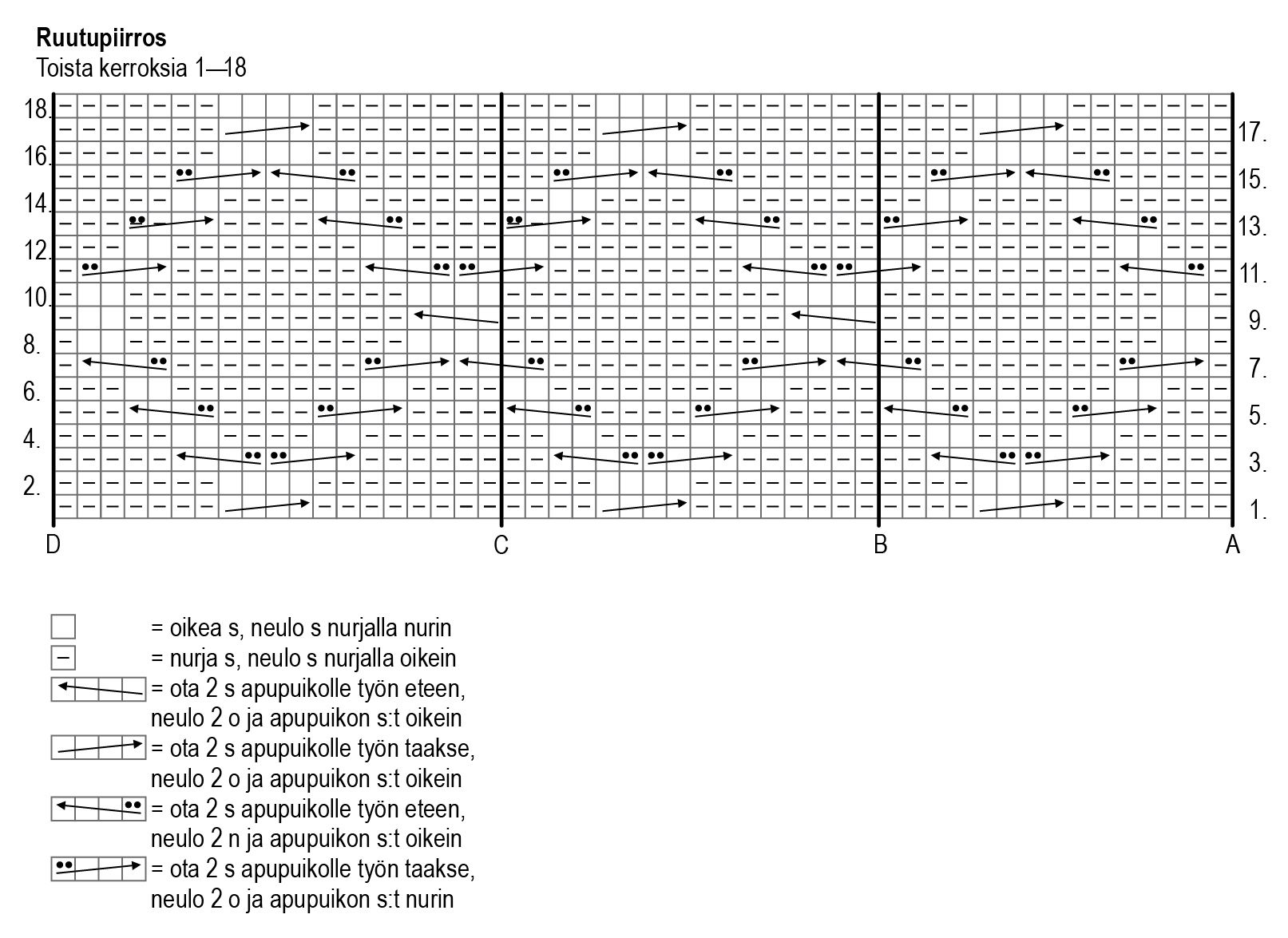 Aloita palmikkoneule ruutupiirroksen 1. kerrokselta: neulo väli A-B (= 15 s), toista väli B-C 4 kertaa (= 64 s) ja neulo vielä väli C-D (= 19 s). Neulo ruutupiirroksen kerrokset 2-18 ja toista sitten kerroksia 3-18.
