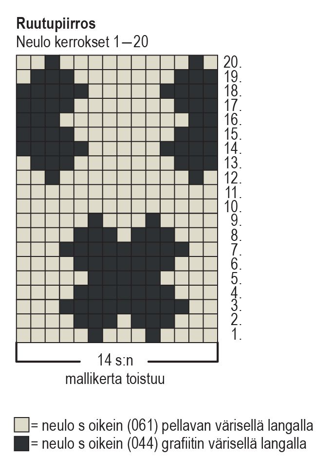 Aloita kirjoneule suljettuna neuleena ruutupiirroksen 1. krs:lta ja toista 14 s:n mallikerta 4 kertaa. Neulo ruutupiirroksen kerrokset 2-20. Tarvittaessa vaihda kirjoneuleeseen paksummat puikot, jotta neule pysyy joustavana.