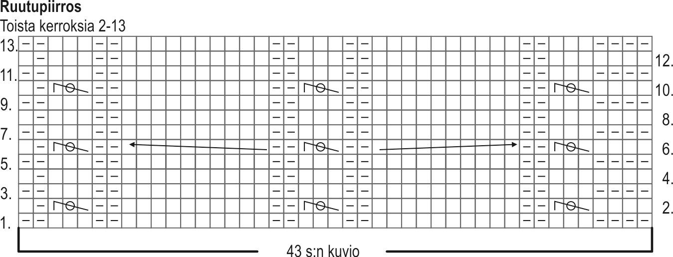 Luo paksummalle puikolle 43 s ja aloita palmikkoneule työn nurjalla puolella ruutupiirroksen 1. kerrokselta (vasemmasta reunasta) ja neulo 43 s:n kuvio. Toista sitten ruutupiirroksen kerrokset 2–13 yhteensä 24(26)28(30)31 kertaa. Päätä s:t. Ompele kaitaleen lyhyet päät yhteen.