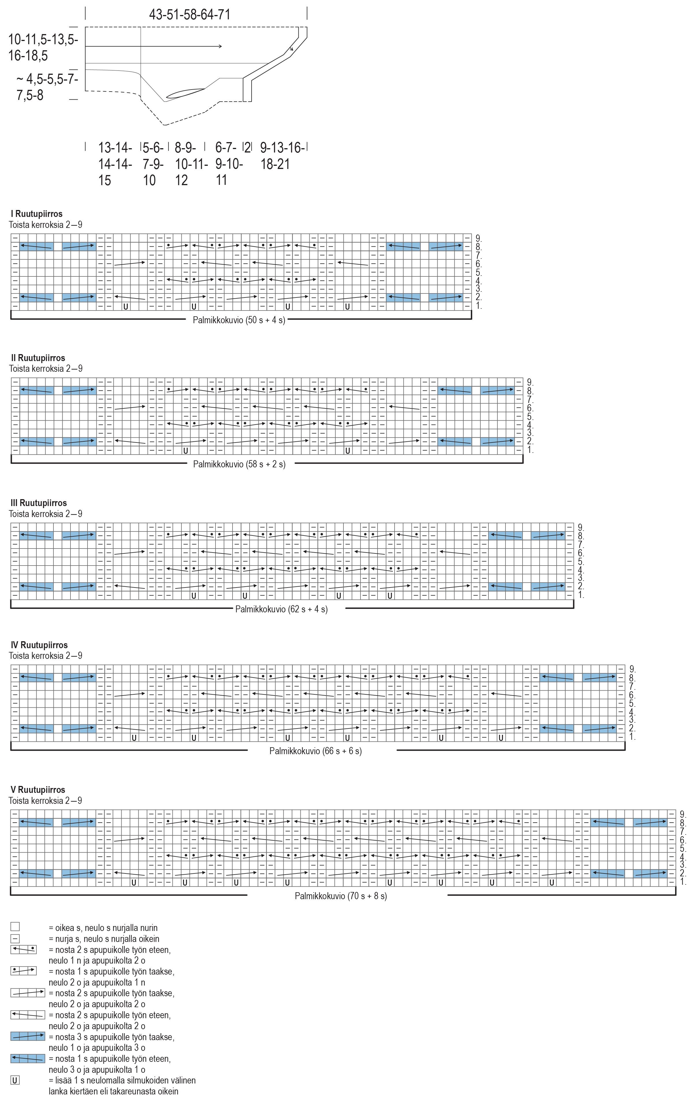 Kun joustinneuleen korkeus on 13(14)14(14)15 cm, vaihda työhön paksummat puikot, aloita palmikkoneule I(II)III(IV)V ruutupiirroksen 1. kerrokselta: neulo palmikkokuvio [54(60)66(72)78 s], neulo loput s:t oikein ja lisää samalla tasaisesti 8(12)16(20)24 s. Kerroksella tuli 12(14)20(26)32 s lisää ja työssä on nyt 80(94)108(118)132 s. Toista palmikkoneuleessa ruutupiirroksen kerroksia 2-9 ja neulo muilla silmukoilla sileää neuletta suljettuna neuleena.