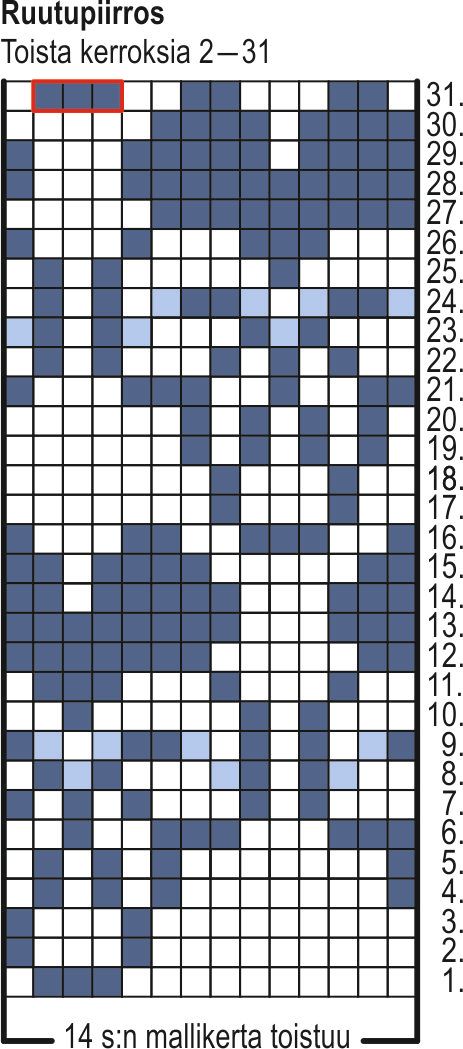 Aloita kirjoneule ruutupiirroksen 1. kerrokselta ja toista 14 s:n mallikerta 5 kertaa. Neulo ruutupiirroksen kerrokset 2–31 ja toista sitten kerroksia 2–31.