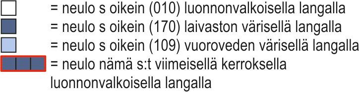Neulo laivaston värisellä langalla ensin 1 krs oikein ja neulo sitten kierrettyä joustinneuletta 8 krs. Päätä s:t.