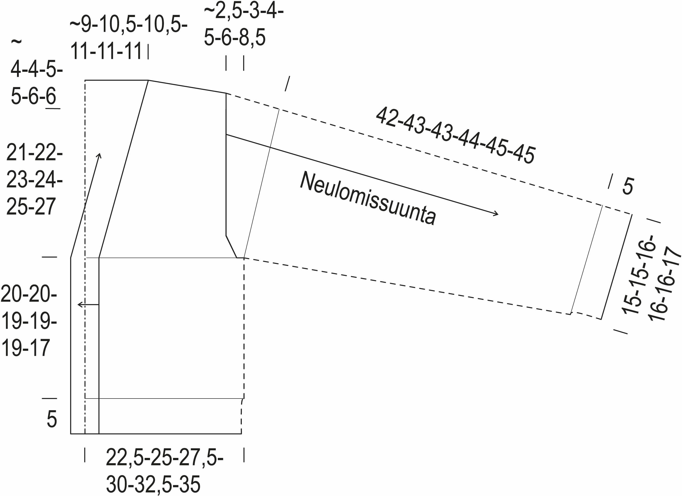 Huomioitavaa Takin alaosa neulotaan yhtenäisenä, edestä auki. Yläosat neulotaan erikseen tasona. Hihojen s:t poimitaan kädentieltä ja hihat neulotaan suljettuna neuleena kädentieltä hihansuuhun.