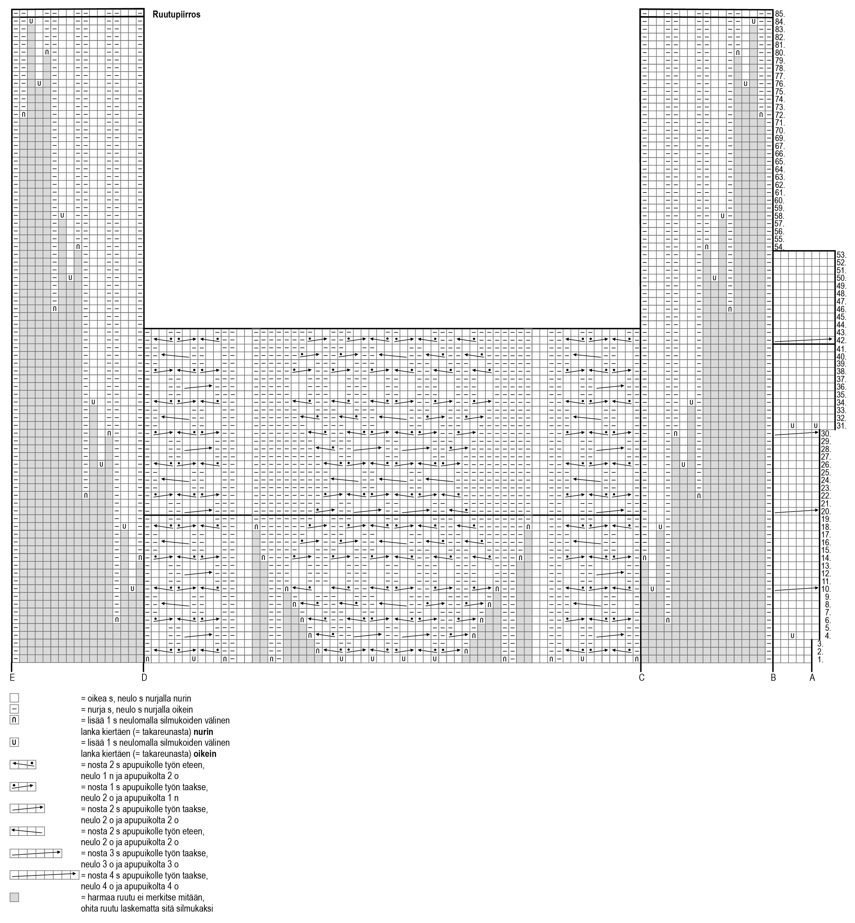 Neulo välissä A-B kerrokset 20-41 ja toista sitten kerroksia 42-53. Neulo välissä B-C ja D-E kerrokset 20-84 ja toista sitten kerrosta 85. Toista välissä C-D kerroksia 20-43 ja lisää kerroksella 20, 24 ja 32 jokaisen kolmen palmikon molemmille puolille 1 nurja s (väliin C-D tulee yhteensä 18 s lisää = 82 s).
