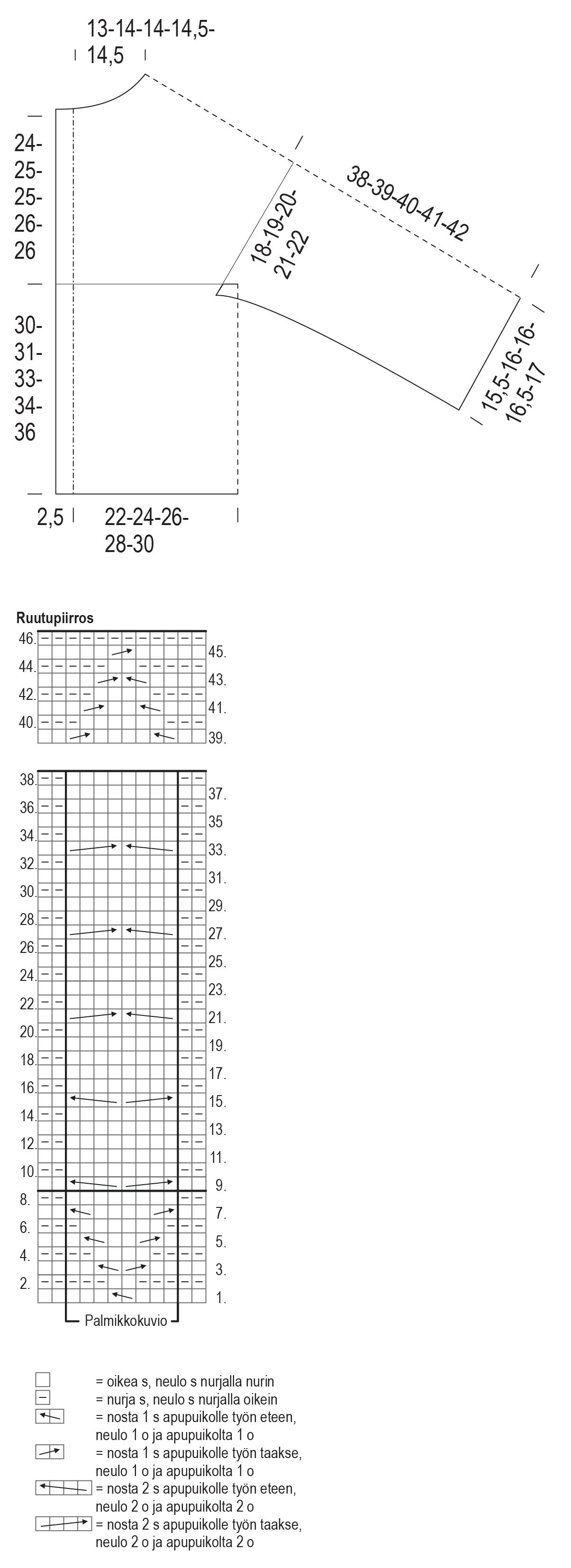 Kun kappaleen korkeus on 4(5)5(6)7 cm, neulo edelleen ainaoikeaa ja aloita palmikkoneule kappaleen keskimmäisillä 8 s:lla ruutupiirroksen 1. krs:n mukaan. Neulo molemmissa reunoissa ainaoikeaa ja neulo palmikossa ruutupiirroksen kerrokset 2-38, neulo kerrokset 9-36 ja neulo vielä kerrokset 39-46.