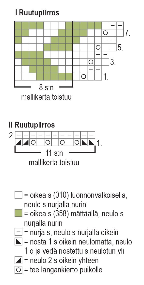 Ota mukaan myös mättään värinen lanka ja aloita köynnöskuvio I ruutupiirroksen 1. kerrokselta: neulo ruutupiirroksen oikeasta reunasta 4 s, toista sitten 8 s:n mallikertaa tarpeen mukaan keskisilmukalle asti, tee luonnonvalkoisella langalla lk, neulo keskisilmukka, lk ja neulo vasen puoli kirjoneuletta oikean puolen peilikuvana. Neulo ruutupiirroksen kerrokset 2-8.