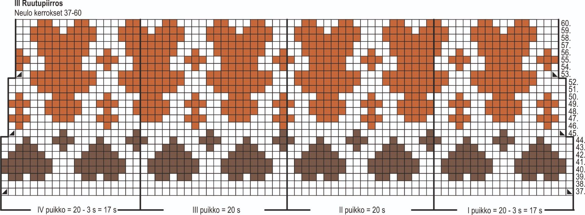 Jatka neulomista suljettuna neuleena VI ruutupiirroksen 101. kerrokselta ja neulo vielä ruutupiirroksen kerrokset 102–113. Kiilakavennuksissa kerroksilla 101, 103, 105, 107, 109, 111 ja 113 kaventuu aina I puikon lopussa ja IV puikon alussa 1 s. Työssä on 59 s.