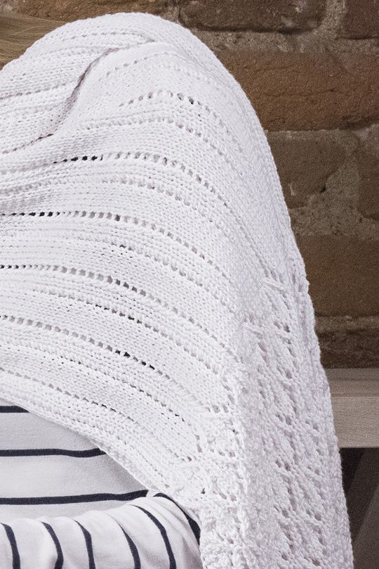 Naisen leveässä, Novita Cotton Bamboosta neulotussa huivissa on pitsikuviota molemmissa päissä. Luottoasuste kesän arkeen ja juhlaan.