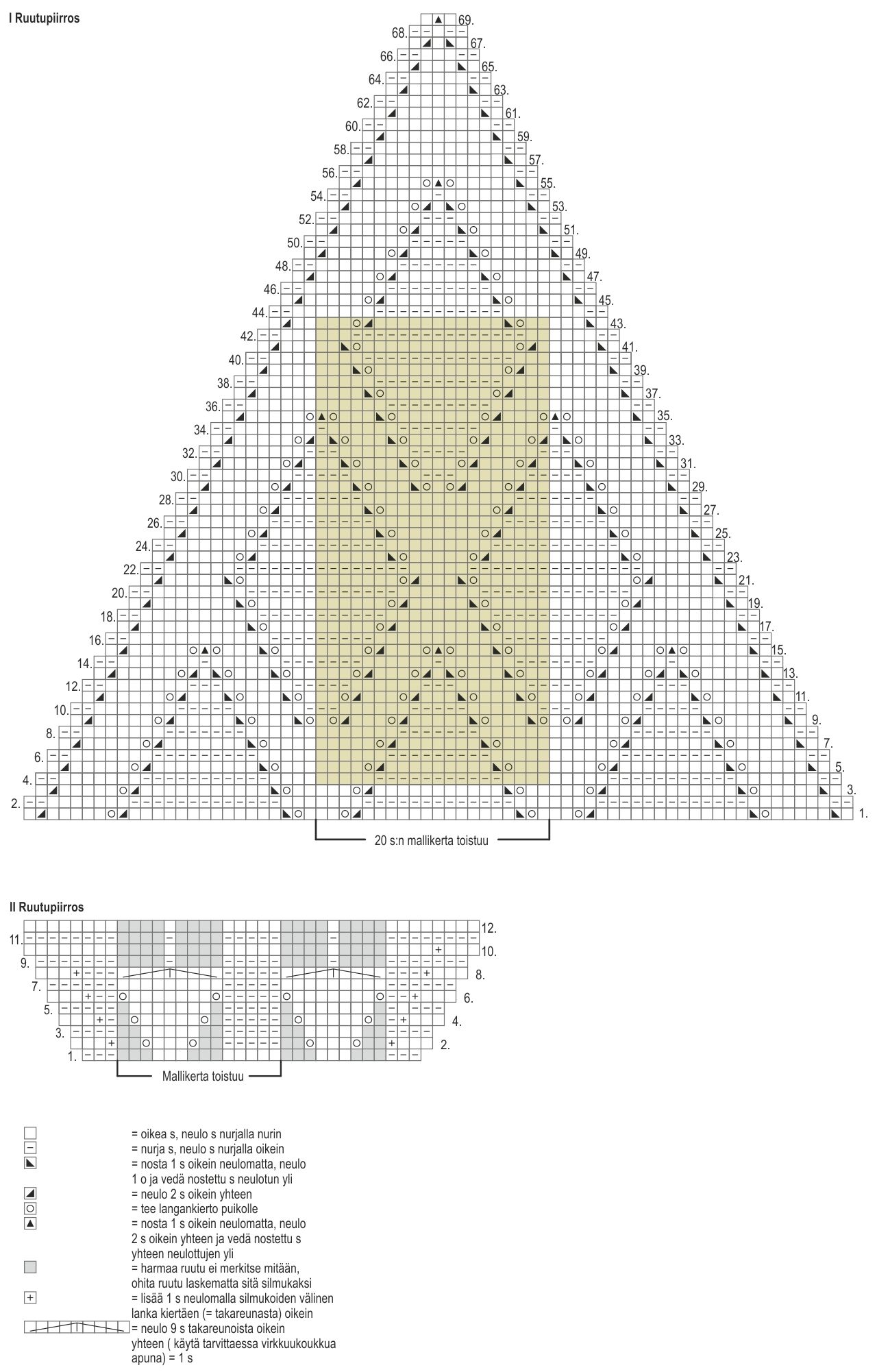 Neulo ensin ruutupiirroksen kerrokset 1-3 ja toista sitten mallikerrassa ruutupiirroksen kerroksia 4-43. Jatka molemmissa reunoissa kavennuksia joka 2. krs piirroksen mukaan, kunnes jäljellä on 3 s. Nosta seuraavalla oikean puolen kerroksella 1 s oikein neulomatta, neulo 2 s oikein yhteen ja vedä nostettu s yhteen neulottujen yli. Katkaise lanka ja vedä se viimeisen s:n läpi.