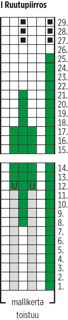 Kun olet neulonut I ruutupiirroksen 14. kerroksen, vaihda työhön kuusikon värinen lanka, neulo sileää neuletta 11 krs ja lisää 4. kerroksella tasaisesti 36(36)39(39)45(45) = 204(216)231(243)261(273) s. Lisää vielä 8. kerroksella tasaisesti 36(36)39(45)45(45) = 240(252)270(288)306(318) s.