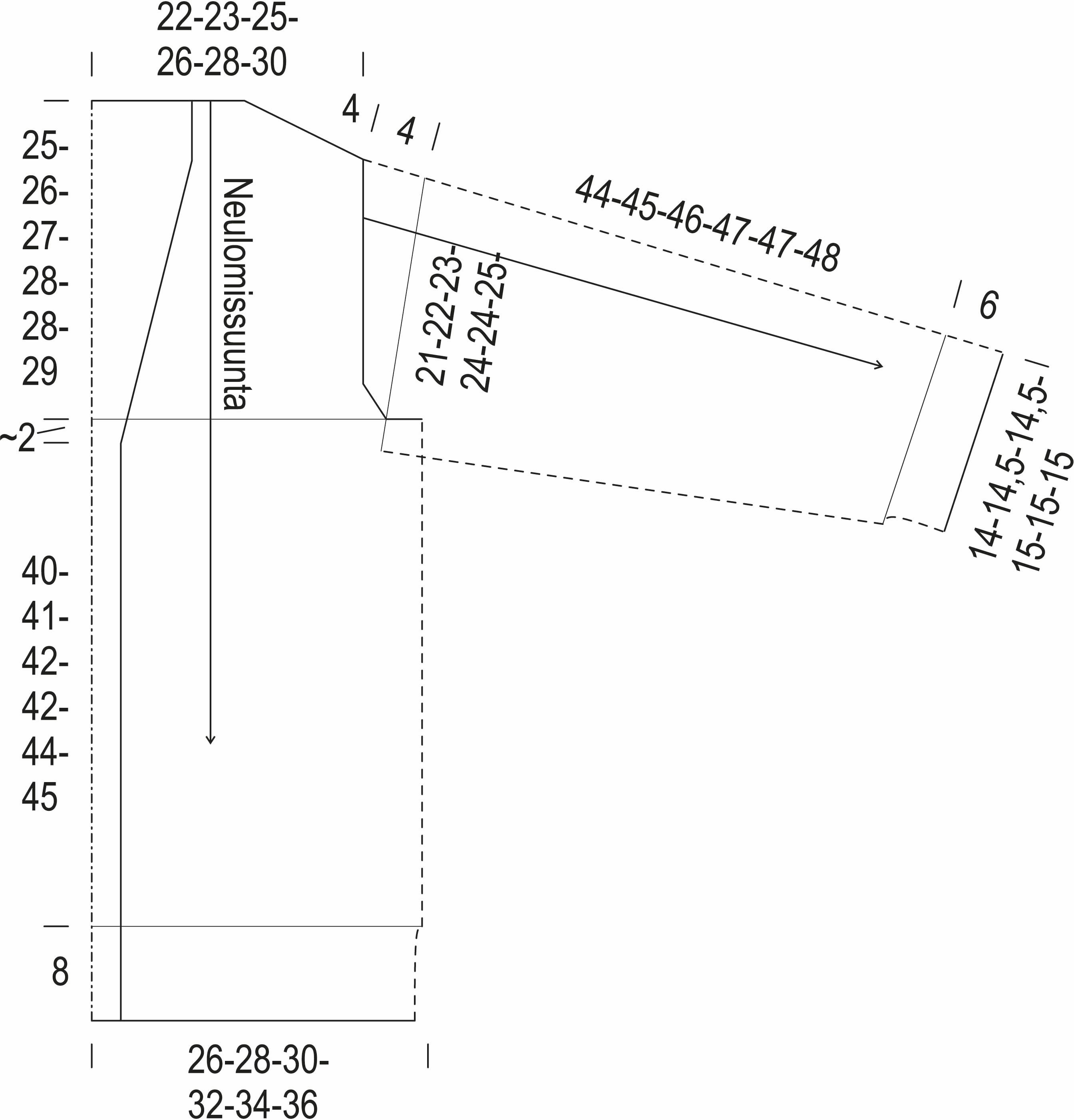 Kun kappaleen korkeus olan puoleisesta ulkoreunasta mitattuna on 18(19)20(21)21(22) cm, aloita seuraavalla oikean puolen kerroksella kädentien lisäykset: