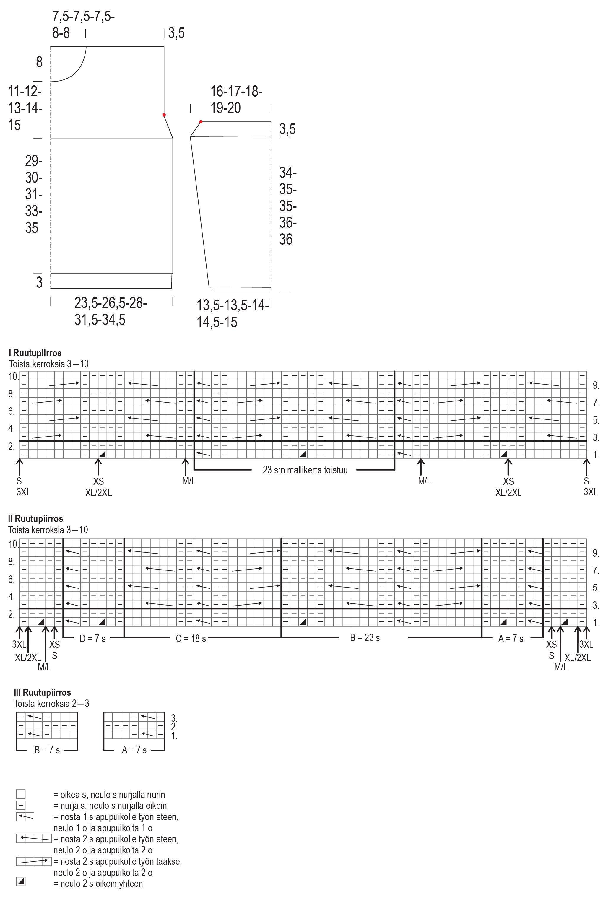 Huom. Kun kappaleen korkeus on 5(4)3(3)3 cm, lisää molemmissa reunoissa 1 s. Toista lisäykset 5(4)3(3)3 cm:n välein vielä 5(3)10(9)5 kertaa ja sitten 4(3)2(2)2 cm:n välein 0(5)0(2)8 kertaa = 92(98)104(110)116 s. Neulo lisätyillä s:illa oikeassa reunassa välin A mukaan ja vasemmassa reunassa välin D mukaan.
