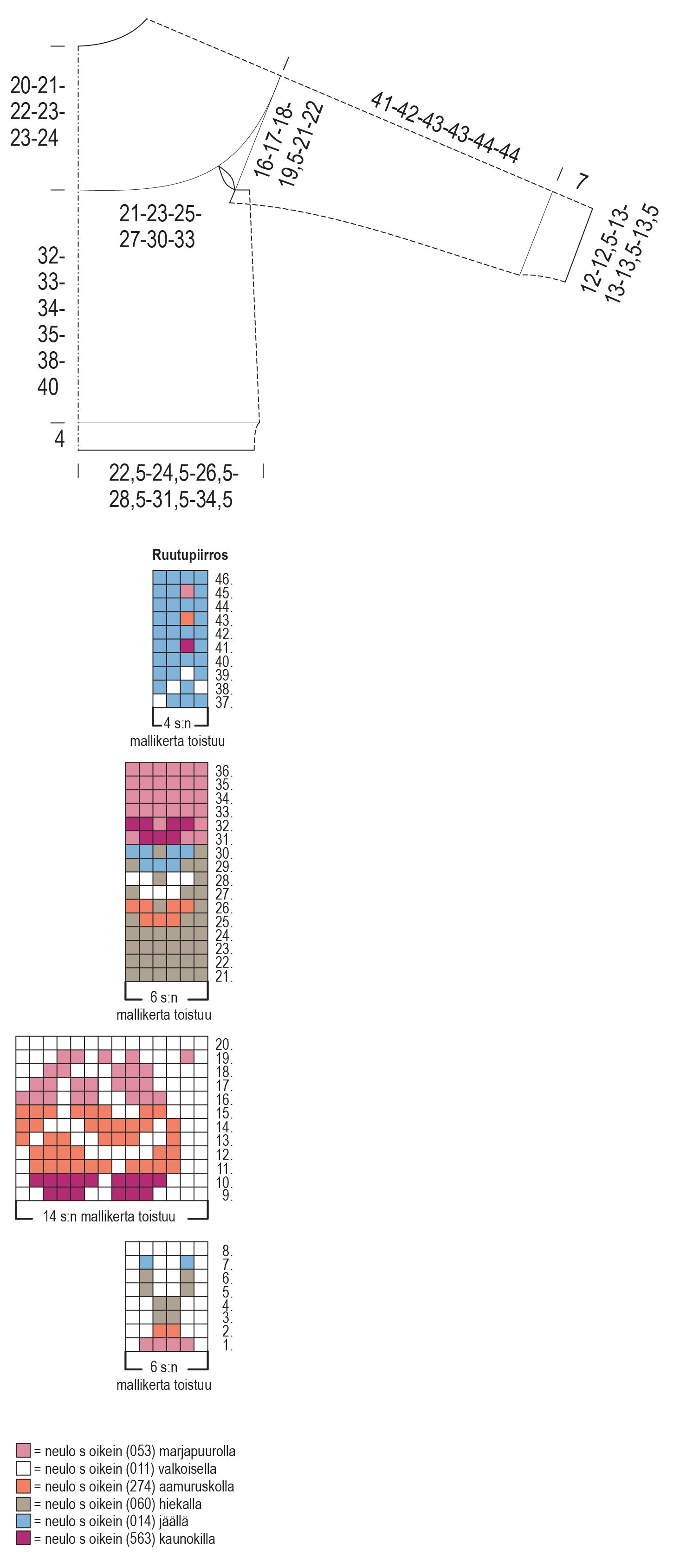 Neulo ruutupiirroksen kerrokset 34–35. Neulo ruutupiirroksen 36. krs ja kavenna samalla tasaisesti 28(30)32(36)38(40) s = 120(124)132(136)148(156) s. Neulo ruutupiirroksen kerrokset 37–46. Kerroksilla toistuu 4 s:n mallikerta 30(31)33(34)37(39) kertaa.