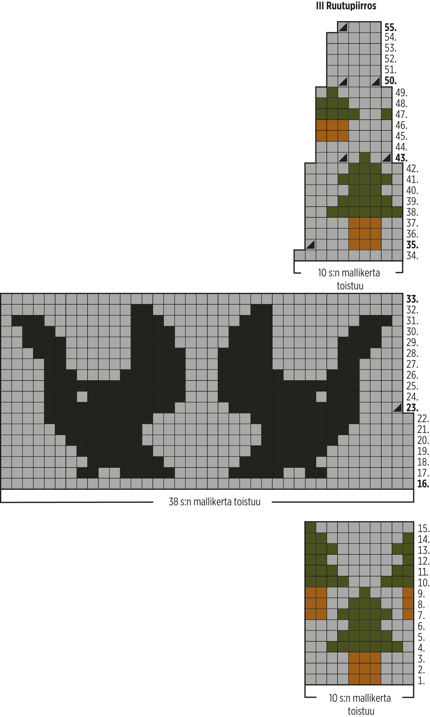 Aloita kirjoneule suljettuna neuleena II ruutupiirroksen 1. kerrokselta ja toista 7s:n mallikertaa 7(7)7(8)8(8)kertaa=49(49)49(56)56(56)s. Neulo ruutupiirroksen kerrokset 2-5.