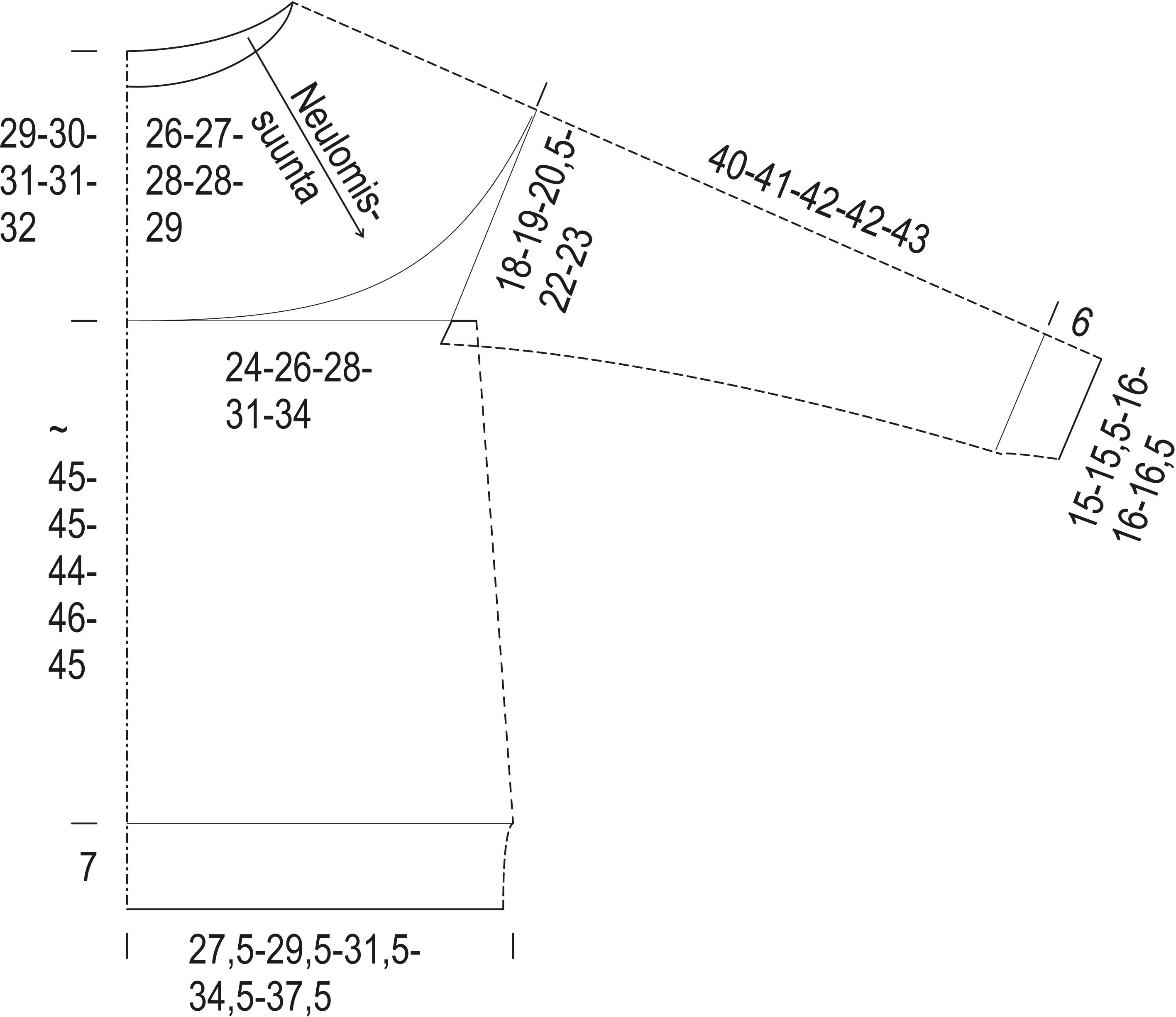 Huomioitavaa Pusero neulotaan pääntieltä alaspäin saumattomana. Katso neulomissuunta kaavasta.