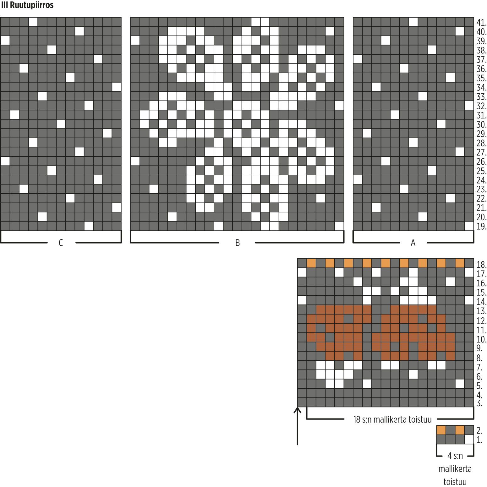 Jatka kirjoneuletta III ruutupiirroksen 19. kerrokselta: *toista väliä A tarpeen mukaan 16 cm, neulo väli B (voit jatkaa pilkkuja lähemmäs kukkaa molemmin puolin) ja toista sitten väliä C tarpeen mukaan sivumerkille*, toista *-*. Neulo ruutupiirroksen kerrokset 20-41.