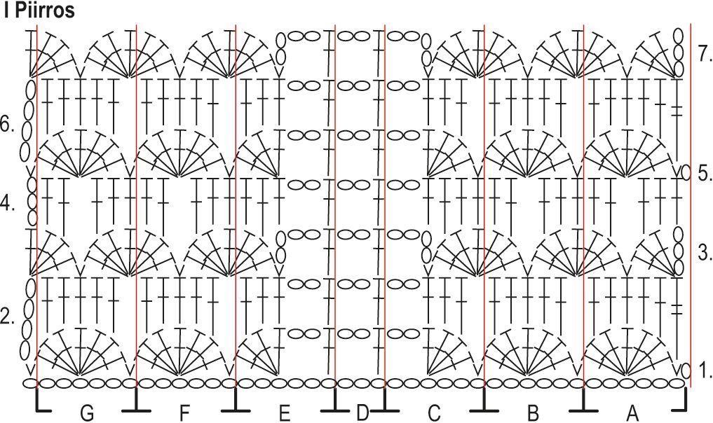 Aloita kuviovirkkaus molemmissa sivuissa ja ruutuvirkkaus kappaleen keskellä I piirroksen 1. kerrokselta: virkkaa väli A: virkkaa 1 kiinteä silmukka (ks) toiseen kjs:aan koukusta laskien, jätä 2 kjs väliin ja virkkaa seuraavaan silmukkaan 7 pylvästä (p), virkkaa väli B: jätä väliin aloitusketjun 2 kjs, tee 1 ks seuraavaan aloitusketjun s:aan, jätä 2 kjs väliin ja virkkaa seuraavaan silmukkaan 7 p, toista väli B vielä 2(3)3(4)5 kertaa, virkkaa väli C: jätä väliin 2 kjs, tee 1 ks seuraavaan aloitusketjun s:aan, jätä 2 kjs väliin ja virkkaa seuraavaan silmukkaan 4 p, tee 2 kjs ja jätä väliin 2 aloitusketjun s:aa, virkkaa väli D: tee seuraavaan aloitusketjun s:aan 1 p, tee 2 kjs ja jätä väliin 2 aloitusketjun s:aa, toista väli D vielä 12(12)13(13)13 kertaa, virkkaa väli E: tee seuraavaan aloitusketjun s:aan 1 p, tee 2 kjs ja jätä väliin 2 aloitusketjun s:aa, virkkaa seuraavaan silmukkaan 4 p, jätä väliin 2 kjs, virkkaa väli F: tee seuraavaan aloitusketjun s:aan 1 ks, jätä 2 kjs väliin, virkkaa seuraavaan silmukkaan 7 p ja jätä väliin 2 aloitusketjun s:aa, toista väli F vielä 2(3)3(4)5 kertaa, virkkaa väli G: tee seuraavaan aloitusketjun s:aan 1 ks, jätä 2 kjs väliin ja virkkaa seuraavaan silmukkaan 7 p, jätä väliin 2 aloitusketjun s:aa ja virkkaa viimeiseen aloitusketjun s:aan 1 ks.