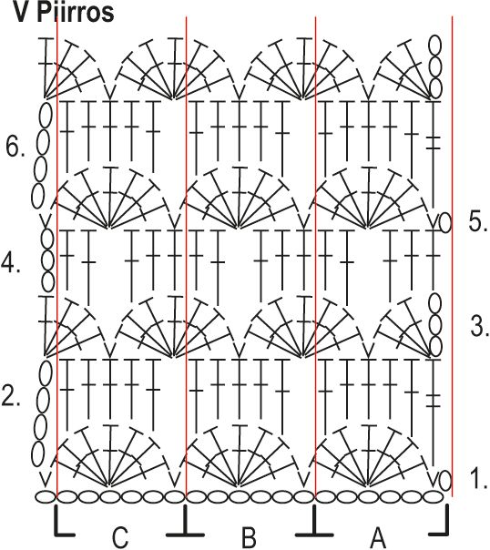 Aloita kuviovirkkaus V piirroksen 1. krs:lta seuraavasti: virkkaa väli A: virkkaa 1 ks toiseen kjs:aan koukusta laskien, jätä 2 kjs väliin ja virkkaa seuraavaan silmukkaan 7 p, virkkaa väli B: jätä väliin aloitusketjun 2 kjs, tee 1 ks seuraavaan aloitusketjun s:aan, jätä 2 kjs väliin ja virkkaa seuraavaan silmukkaan 7 p, toista väli B vielä 13(15)16(18)20 kertaa ja virkkaa väli C: tee 1 ks seuraavaan aloitusketjun s:aan, jätä 2 kjs väliin ja virkkaa seuraavaan silmukkaan 7 p, jätä väliin 2 aloitusketjun s:aa ja virkkaa viimeiseen aloitusketjun s:aan 1 ks.