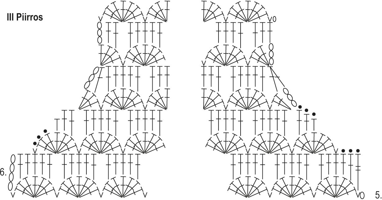 Kun kappaleen korkeus on noin 26(26)26(29)29 cm ja olet viimeksi virkannut piirroksen kerroksen 6, tee kädentien kavennukset II(II)III(III)III piirroksen mukaan. Molemmista reunoista kaventuu 2(2)4(4)4 kerroksen aikana 1½(1½)2(2)2 mallikertaa pois työstä.