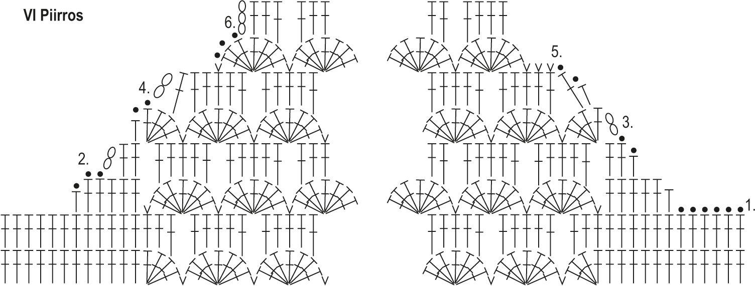 Työhön tuli 16(18)19(21)23 mallikertaa (pylväsviuhkaa). Jatka virkkaamista V piirroksen mukaan 2. kerrokselta ja toista sitten kerroksia 3-6.
