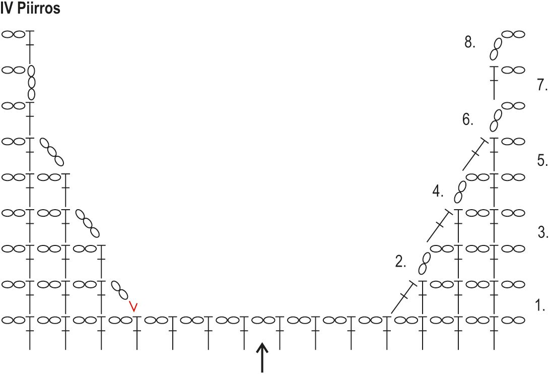 Kiinnitä lanka 1 ks:lla pääntien reunaan, piirroksen punaisten merkkien mukaan, ja virkkaa pääntien vasen puoli vastaavasti IV piirroksen mukaan. Kun kädentien korkeus on 19(20)21(22)23 cm, katkaise lanka.