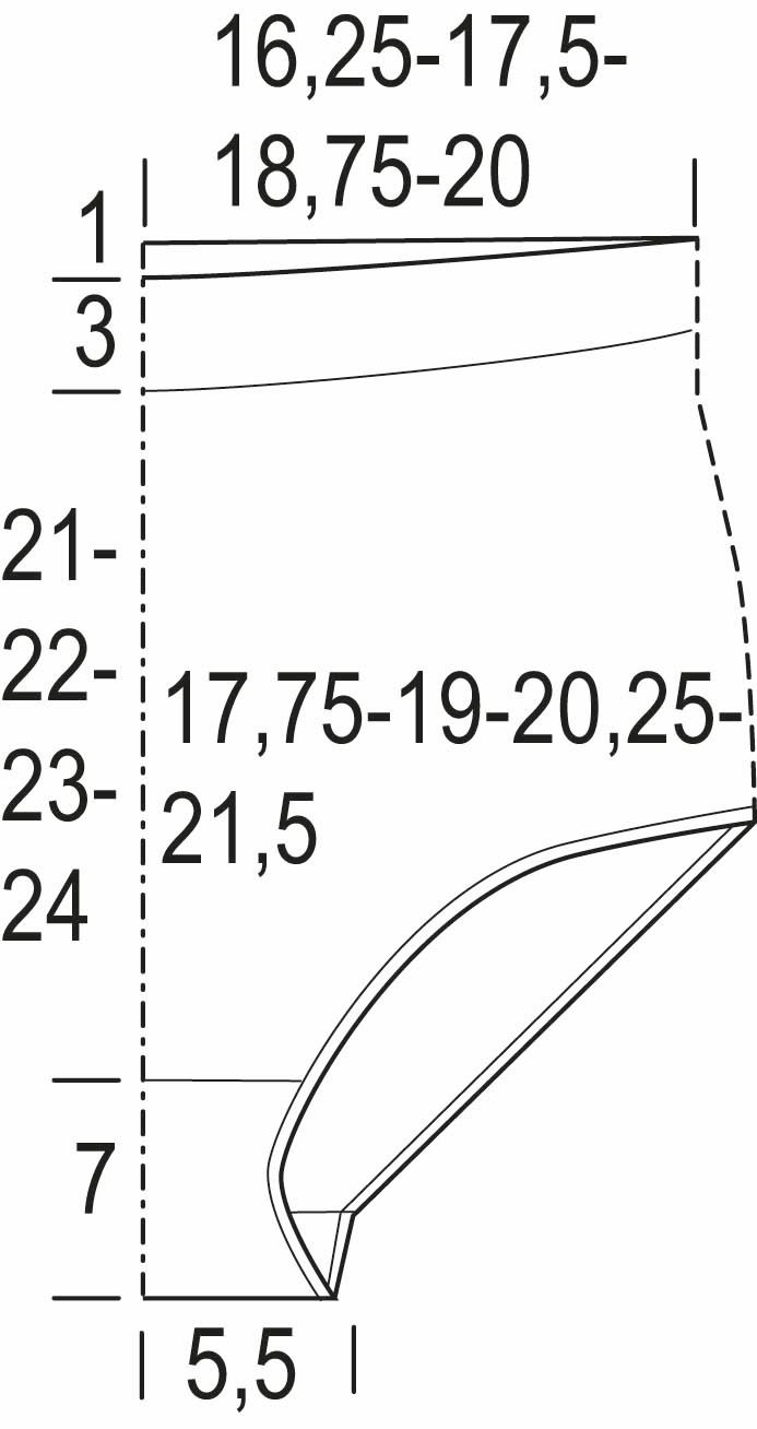 Aloita nurjan puolen kerroksella ja neulo sileää neuletta tasona 3 krs. Jatka sileää neuletta ja aloita kiilan kavennukset: neulo 1 o, 2 s oikein yhteen, neulo kunnes kerroksella on jäljellä 3 s, tee ylivetokavennus (nosta 1 s oikein neulomatta, neulo 1 o, vedä nostettu s neulotun yli), neulo 1 o. Toista kavennukset joka 4. krs vielä kerran = 13(14)15(16) s. Neulo 7 krs:ta ja aloita seuraavalla OP:n kerroksella kiilan lisäykset: neulo 1 o, L1O, neulo kunnes kerroksella on jäljellä 1 s, L1V, 1 o. Toista lisäykset joka 4. krs vielä 5 kertaa = 25(26)27(28) s. Neulo 2 krs:ta sileää neuletta ja neulo sitten taitetta varten seuraava NP:n kerros oikein.