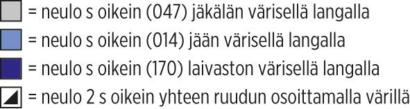 Mallineuleet Kierretty joustinneule suljettuna neuleena: neulo *1 s kiertäen eli silmukan takareunasta oikein, 1 n*, toista *-*. Sileä neule suljettuna neuleena: neulo kaikki kerrokset oikein. Kirjoneule: neulo sileää neuletta ruutupiirroksen ja ohjeen mukaan.