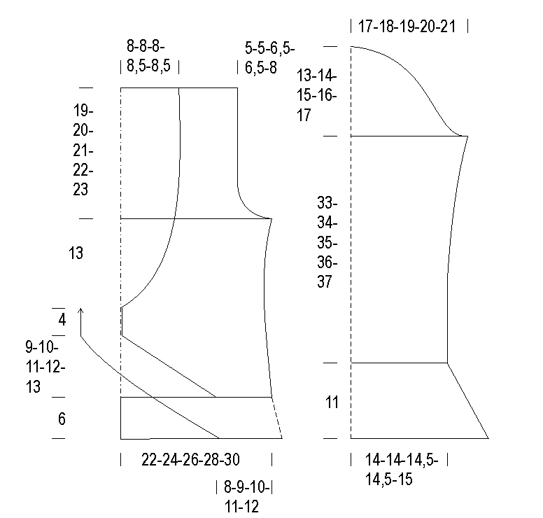 Luo 85(85)88(88)91 s ja aloita 2 n, 1 o -joustinneule työn nurjan puolen krs:lla 1 n. Kun jousteen korkeus on 8 cm, neulo jokaisessa 2 n -joustinraidassa 2 n yhteen = 57(57)59(59)61 s. Jatka 1 o, 1 n -joustinneuletta kunnes jousteen korkeus on yhteensä 11 cm ja aloita sitten pitsineule. Ruutupiirrokseen on nuolella merkitty hihan keskikohta, laske siitä kuvion alkamiskohta. Toista ruutupiirroksen krs:a 1.-8. Huom. Ole huolellinen pitsin kavennusten ja lisäysten kanssa. Jokaista kavennusta vastaa aina lisäys ja päinvastoin niin, että s-luku pysyy oikeana. Kun kpl:n korkeus on 21(21)19(23)21 cm, lisää hihan molemmissa reunoissa 1 s. Toista lisäykset vielä joka 10.(8.)8.(6.)6.krs 5(7)8(10)11 kertaa = 69(73)77(81)85 s. Neulo lisätyilläkin s:illa pitsineuletta. Kun kpl:n korkeus on 44(45)46(47)48 cm, päätä molemmissa reunoissa joka 2.krs 1x3(3)4(4)5 s, 1(1)1(2)2x2 s, 18(20)21(21)22x1 s pyöriötä varten. Päätä sitten loput s:t kerralla.